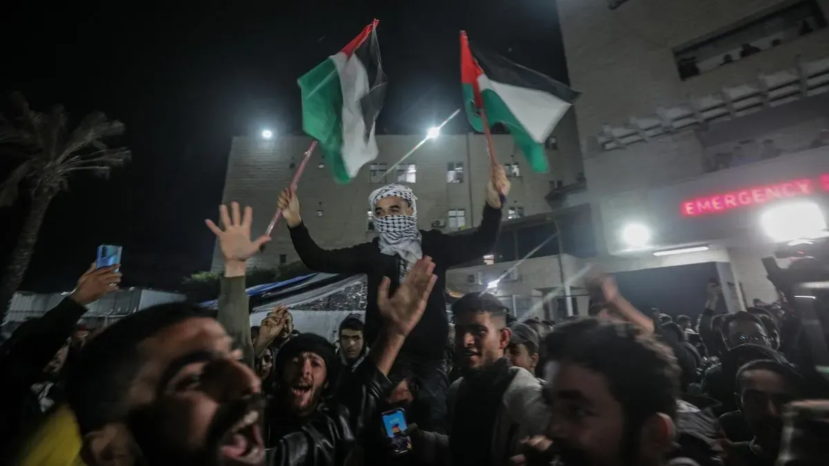 Palestinos, en Deir al Balah, en el centro de la Franja de Gaza, reaccionan a la noticia de un acuerdo de alto el fuego con Israel tras 15 meses de conflicto. | Fuente: EFE | Fotógrafo: